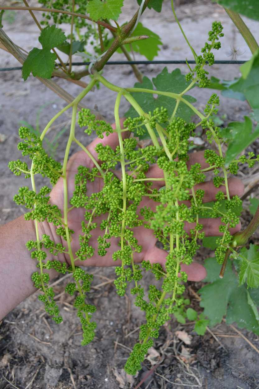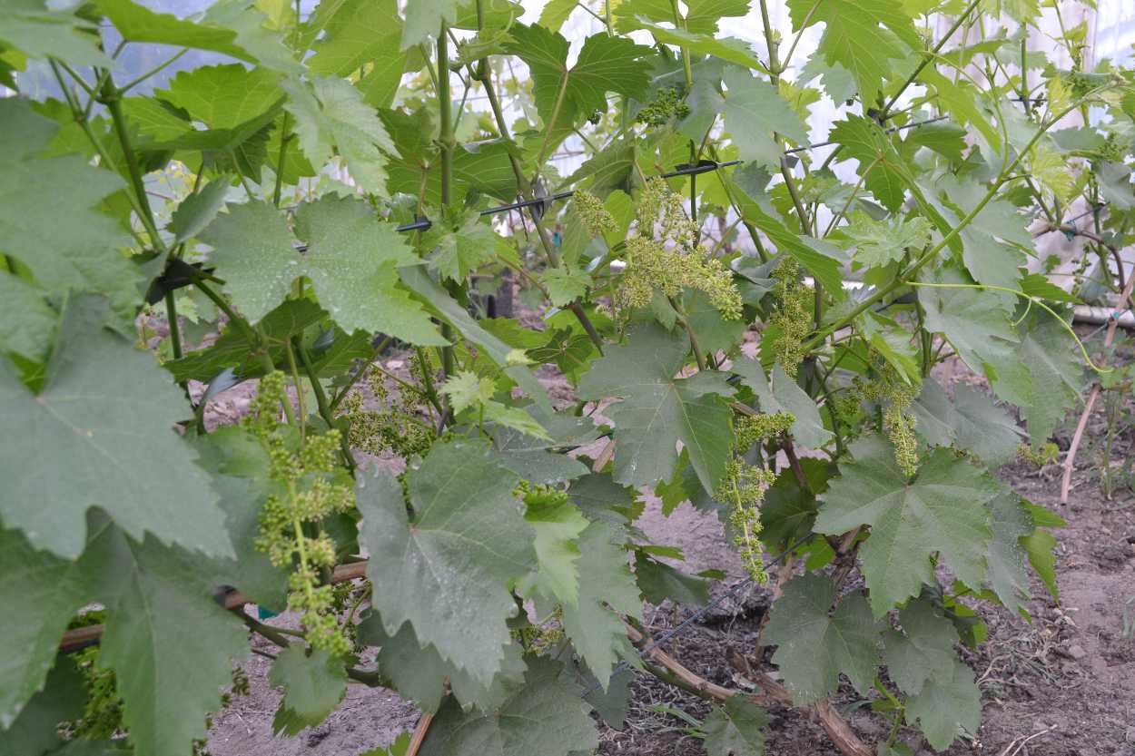 W tunelach od paru dni zaczęło się kwitnienie. Dzisiaj dopiero to zauważyłem. Jako pierwsza rozpoczęła moja najwcześniejsza odmiana jaką jest Garod. Bardzo ją cenie właśnie za wczesność oraz bardzo dobry smak – słodki z przyjemnym muskatem. Zawiązuje po 3-4 kwiatostany na latorośli. Jestem już w połowie redukcji a ciąg dalszy nastąpi.
