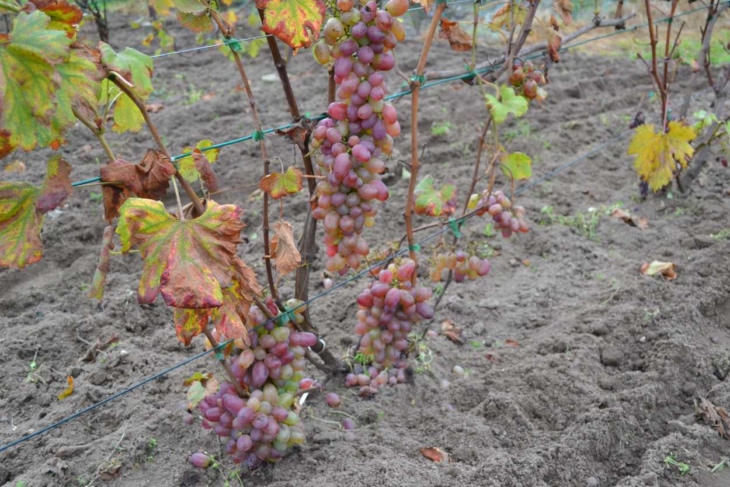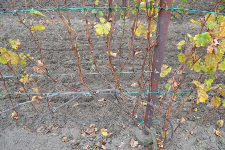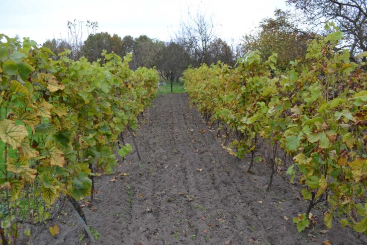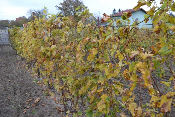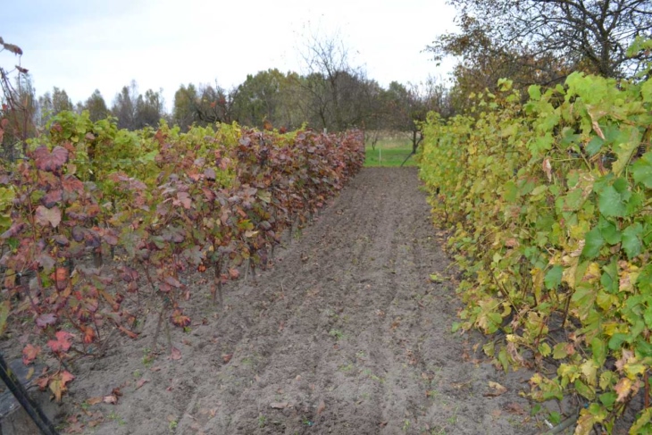 Sezon powoli się kończy. Przymrozków jesiennych nie widać zatem wegetacja trwa dalej. Liście ładnie się przebarwiają. Wisi jeszcze parę gron, które chętnie dziobią ptaki bo siatki już zdjęliśmy. Niedawno pracowała w międzyrzędziach glebogryzarka a w rzędach odbywało się haczkowanie. Czekam na mróz aby zrobić porządki i wstępnie przyciąć krzewy.