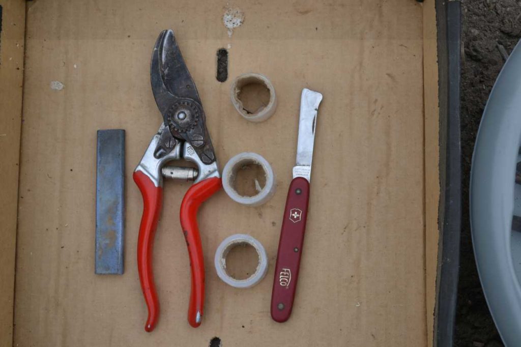 Do szczepienia potrzebny jest sekator, nóż oraz paski folii. Ja używam zwykłej folii spożywczej pociętej na 2cm krążki.