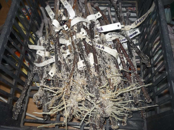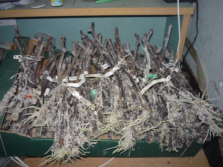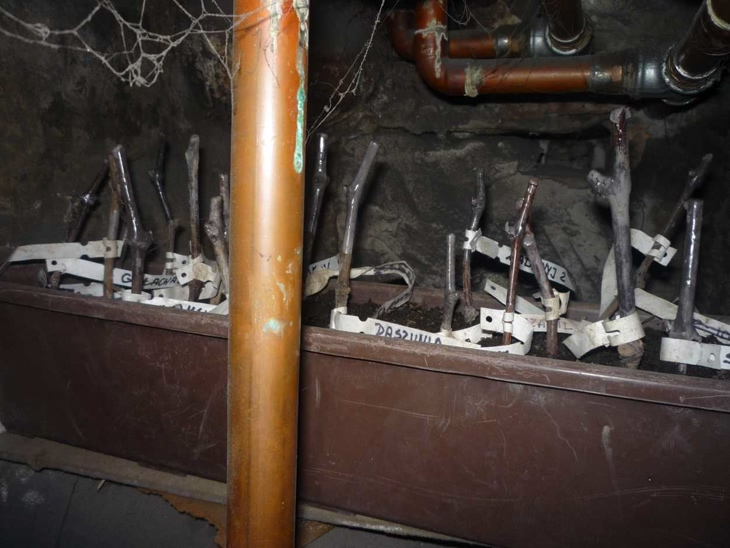 Część cennych patyków mam słabej jakości i do tego krótkich. Zginęłyby przysypane perlitem w ukorzeniarce dlatego eksperymentalnie wsadziłem je do podłużnej donicy i postawiłem na rury co w piwnicy. Pogrzeje je tam trochę i przeniosę do domu.
