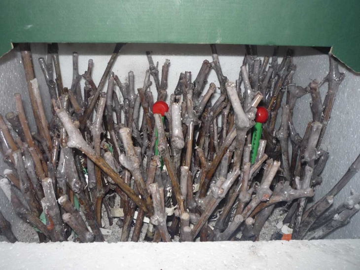 Dzisiaj rozpocząłem pierwszą turę ukorzeniania. Sztobry wykopałem dwa dni temu. Były w bardzo dobrej kondycji, zdrowe bez śladów pleśni czy zgnilizny. Standardowo dobę wymoczyłem w wodzie a potem kilkanaście godzin w 0,2% Topsinie. Następnie woskowanie , kaleczenie oraz obcinanie dolnych pąków oraz pudrowanie w ukorzeniaczu Aqua AB.. No i prawie wszystko zapakowałem do ukorzeniarki ustawiając temperaturę początkową na 28C. Ponieważ nie ufam termoregulatorowi temperatury pilnują dwa termometry. Mógłby być jeden ale w mojej ukorzeniarce najcieplej jest w środku a najzimniej na bokach i mierzę temperatury w obu tych miejscach.