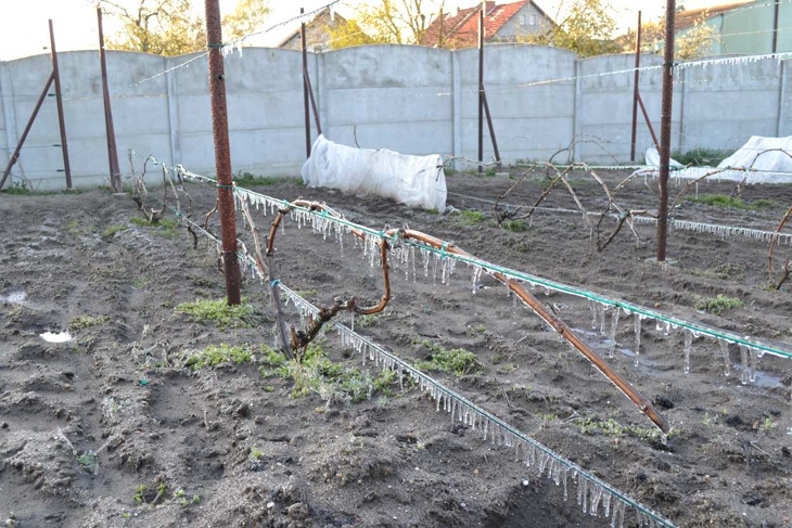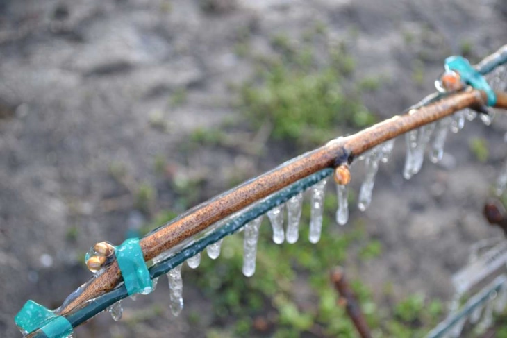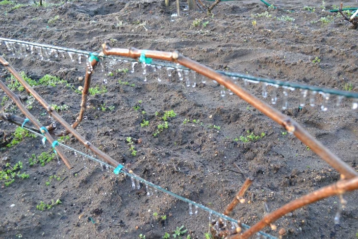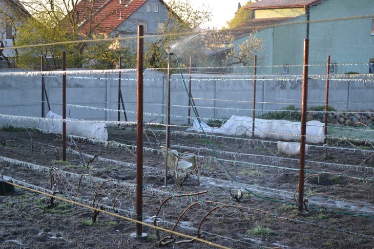 Dzisiaj w nocy temperatura spadła poniżej 0C. Ponieważ krzewy mają już mocno rozwinięte pąki postanowiłem nie ryzykować i włączyć zraszacze. Były też cztery ogniska ale właściwie nic nie dały bo dym unosił się pionowo do góry. Alarm na stacji pogodowej uruchomił się o 1.30 przy temperaturze 0,5C. Wstałem, pobiegłem na winniczkę, załączyłem dwa zraszacze bijakowe i rozpaliłem ogniska. Po godzinie poszedłem spać i rano zastałem widok jak poniżej. Dodam, że minimalnie było -2C i chyba nie potrzebne całe zamieszanie bo krzewy nie zraszane też są bez uszkodzeń.
