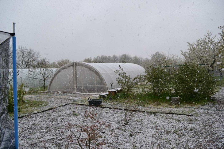 Kolejna noc z przymrozkami tym razem do -1,5C. Znów załączyłem zraszacze i poszło około 8m3 wody. Rano zaczął padać śnieg.