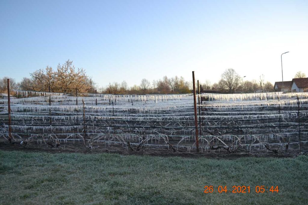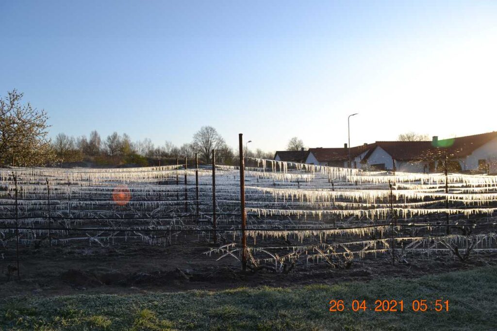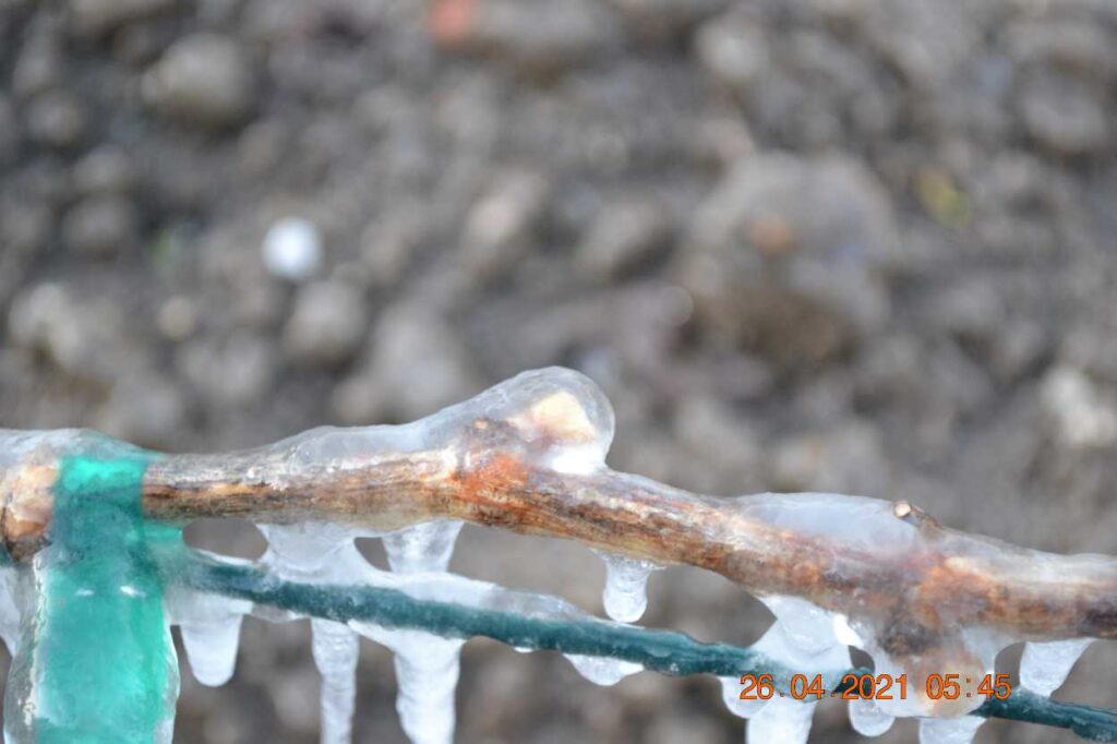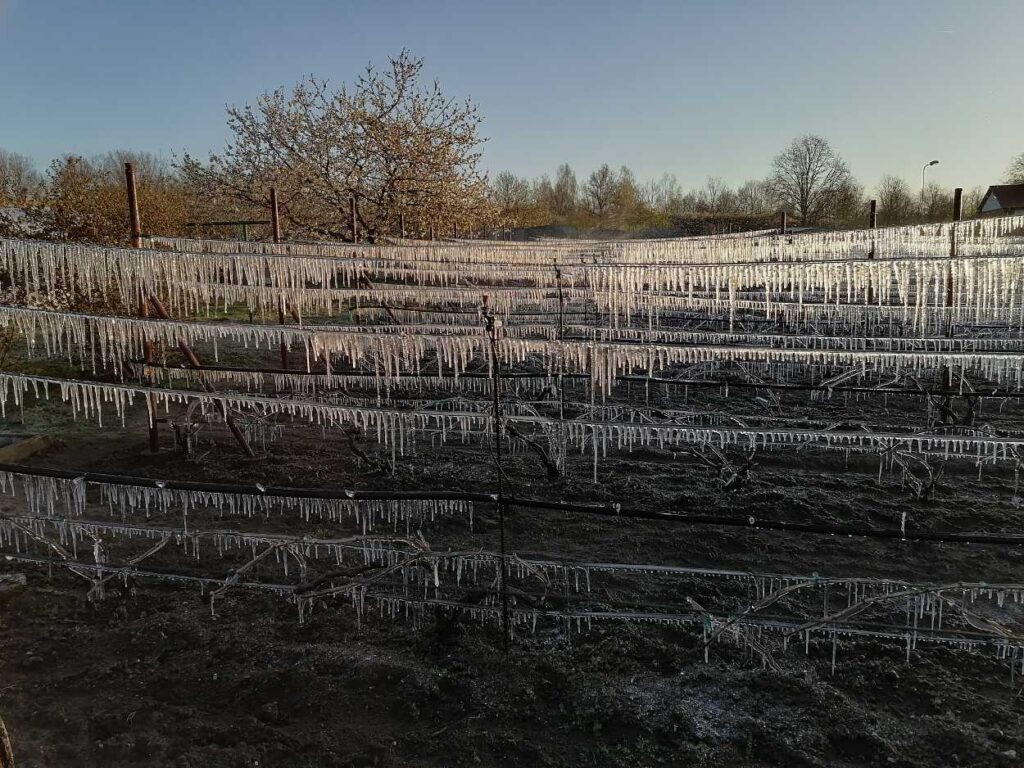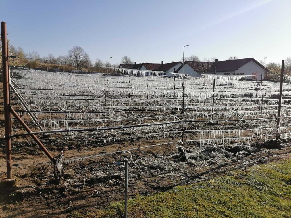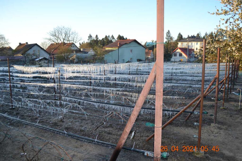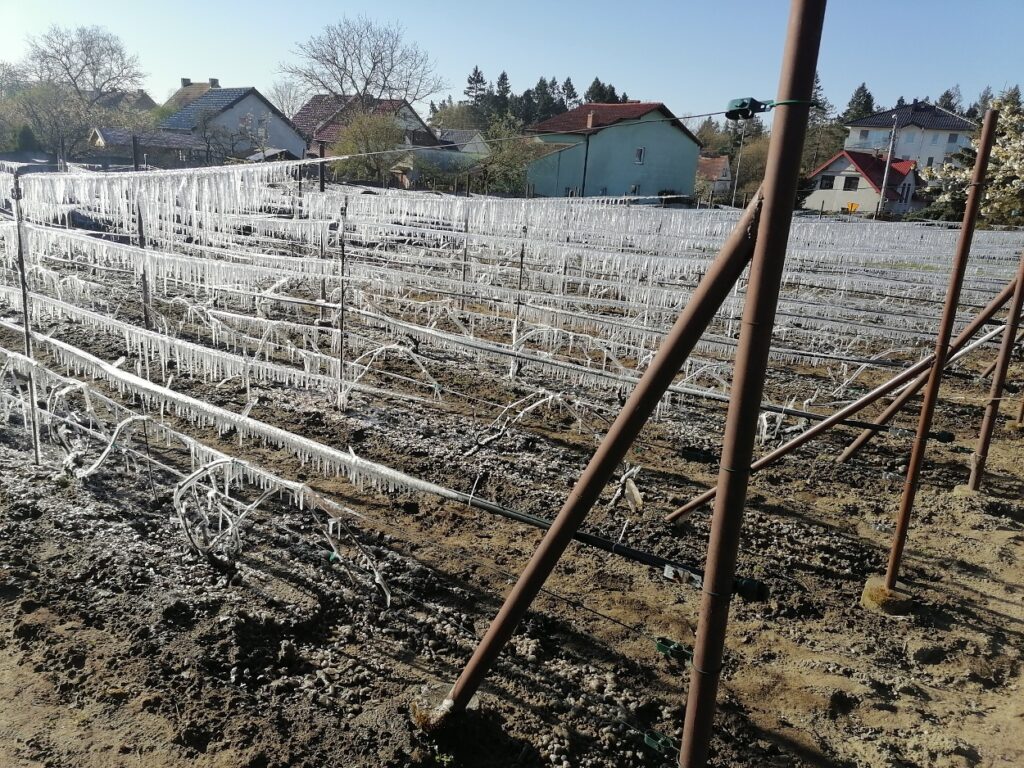 Walka z przymrozkami tym razem w kwietniu jak co roku była niezbędna. Zaczęło się 26 kwietnia gdzie nad ranem temperatura spadła do około -5C, następnego dnia było podobnie a trzeciego już przymroziło tylko -2C. Choć wegetacja w tym roku jest mocno opóźniona to najwcześniejsze odmiany w gruncie miały już otwarte pąki i musiałem działać. Testowałem po raz pierwszy flippery i musiałem wszystko na bieżąco regulować. Wcześniej skalibrowałem czujnik temperatury, który lekko oszukiwał wskazania. Przy wskazaniu -0,4C było ta naprawdę OC. Usatawiłem bezpiecznie na 1C ale już o 22-ej instalacja ruszyła i aby nie zbankrutować obniżałem temperaturę startu tak realnie do -1C bo pąki w większości dopiero ruszają (zraszacze nie zamarzały bo wyżej było cieplej). To był jednak błąd bo te już otwarte z listkami częściowo wymroziło. Generalnie udało się ocalić bardzo dużo i jestem zadowolony. Co ciekawe w pierwszym dniu różnica temperatur pomiędzy czujnikiem na 2m i 60cm była około 2C. Na górze 2C to na dole 0C. W drugim dniu różnic temperatur prawie nie było.